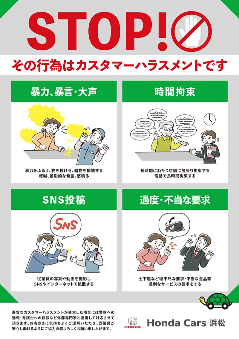 株式会社 ホンダカーズ浜松(以下、当社)は、社員一人ひとりが持つ能力を最大限発揮し、心身ともに健やかに、いきいきと活躍することができ、安全で働きやすい職場環境を確保することが、お客様へ安全で質の高いサービスを提供する基盤であるものと考え「カスタマーハラスメントに対する方針」を策定しております。